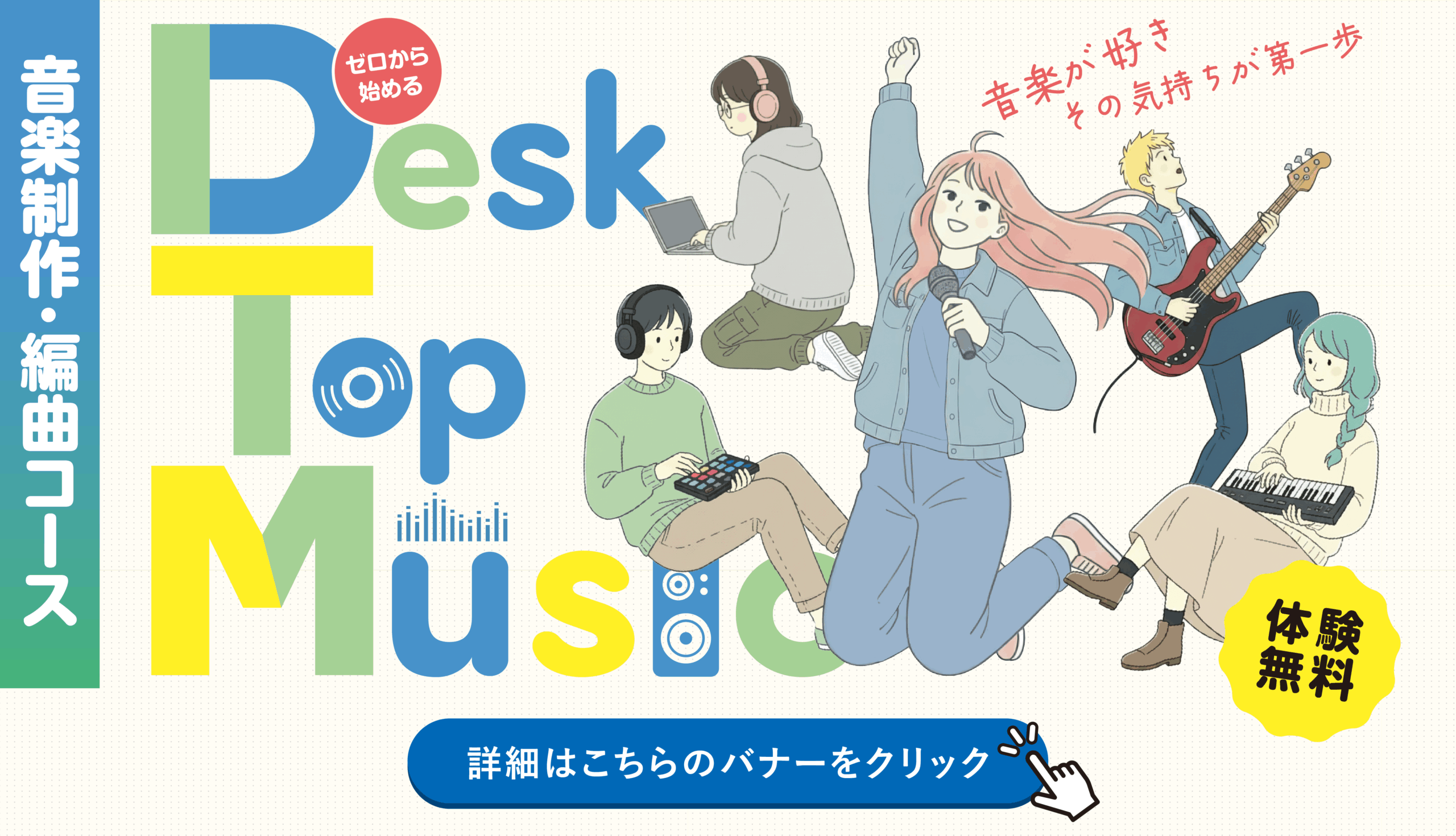 DTMとはDesk Top Music(デスクトップミュージック)の略で、パソコンを使用して音楽を作成・編集する事の総称です。 パソコン上の音源を使って演奏するので楽器が演奏出来なくても、マウス操作で作曲が出来るのが特徴です。 音楽はテレビ番組、アニメ、ゲームなどさまざまなコンテンツで必要とされるため音楽を仕事に活かしたい方へのプログラムです。