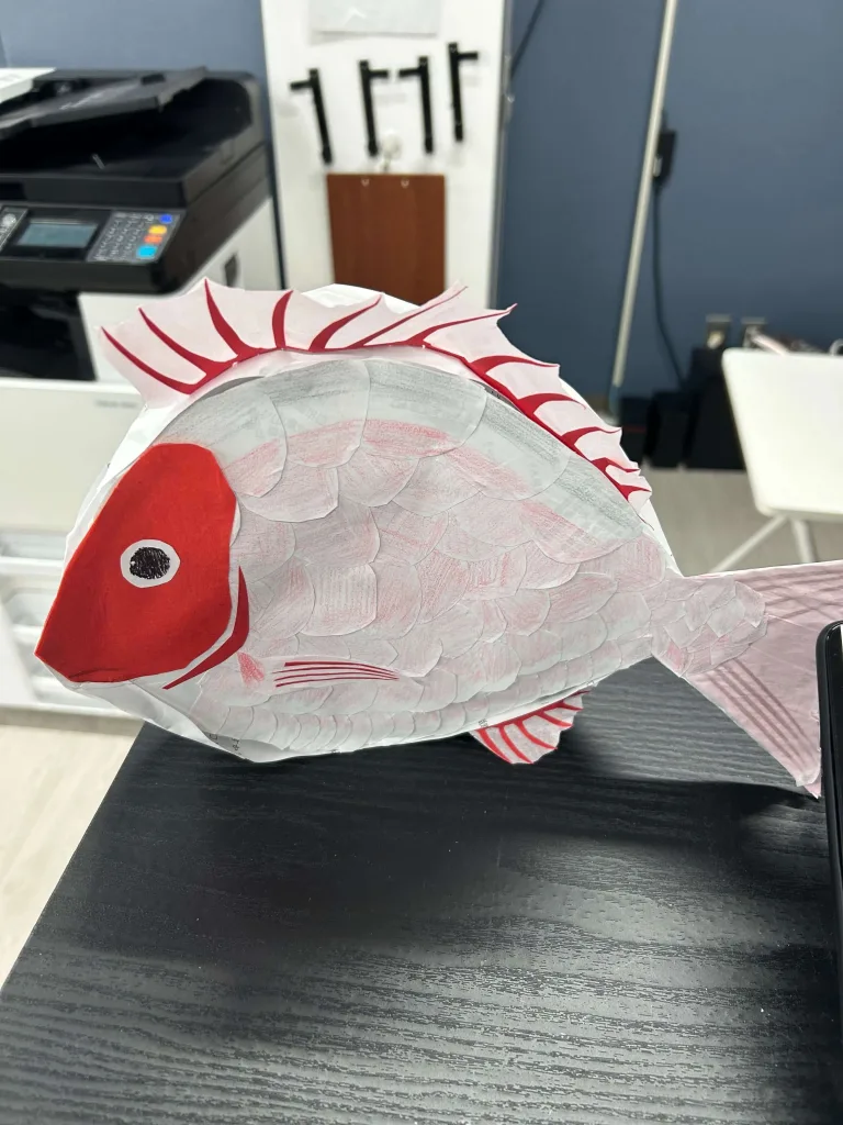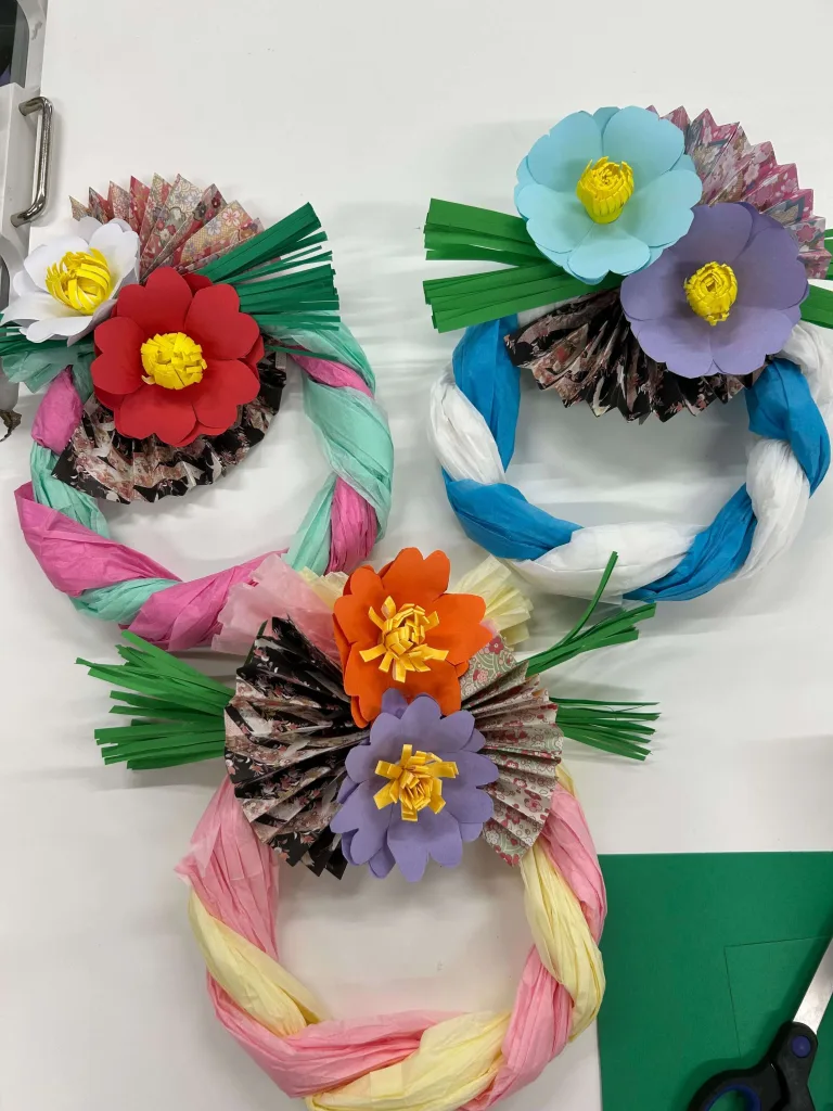 お花紙や画用紙、折り紙を使って作ったしめ飾りや羽子板は、どれも力作ぞろい。中には、立体的な“鯛”を作った方もいて、スタッフ一同びっくり!想像力と器用さに拍手です👏