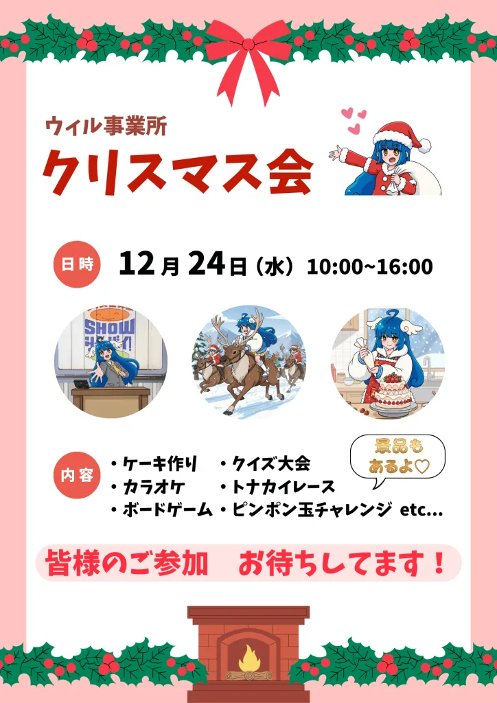 街がクリスマスのイルミネーションで彩られ、年末のあわただしさの中にも、少しだけ「ほっ」とする時間が生まれる12月。今年もウィルでは、たくさんのレクリエーションを通して、利用者の皆さんと笑顔で過ごすことができました。