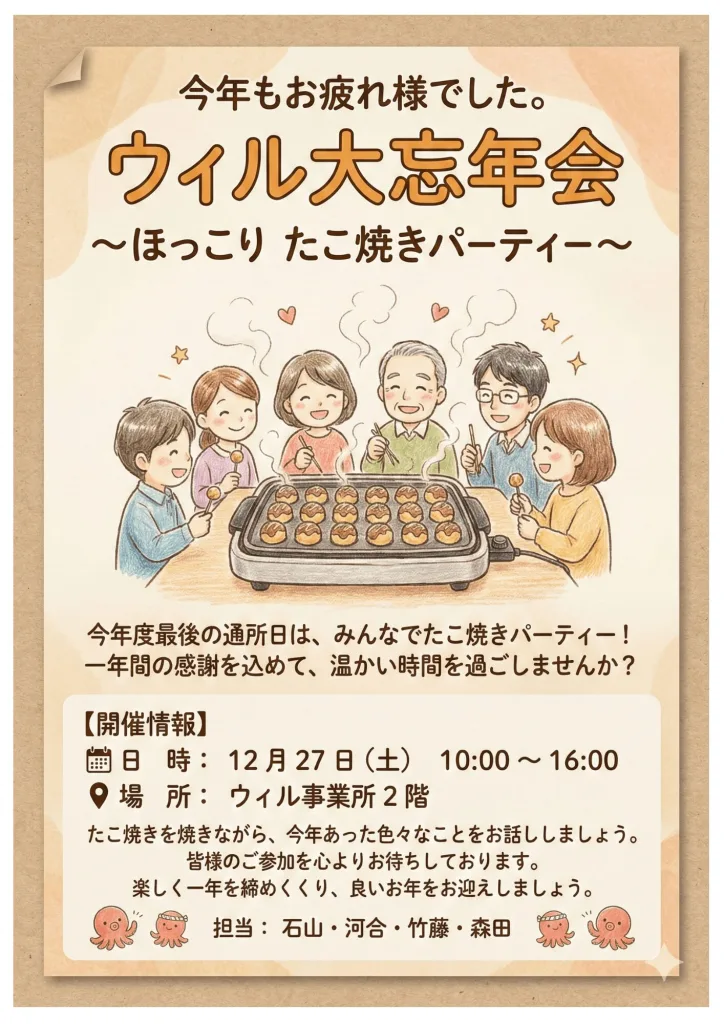 2025年へ向けて…たこ焼き囲んで語らった「ウィル忘年会」